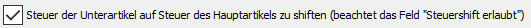 Ist dieser Haken aktiviert, gilt immer die Steuer des Hauptartikels. Dabei spielt es kene Rolle ob der Hauptartikel zuvor bereits geshiftet wurde oder nicht. D.h. der Steuersatz des Hauptartikels wird an die Unterartikel vererbt.