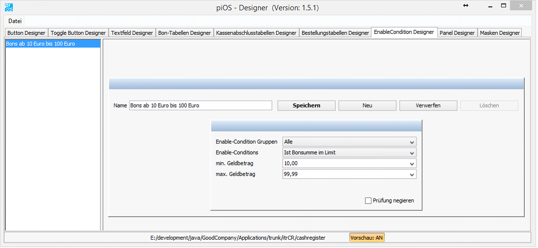 Wäre in diesem Beispiel die Option "Prüfung negieren" gesetzt, dann wäre der 10%-Rabatt Button nur für Bons deren Bon-Summe nicht zwischen 10 und 99,99 Euro liegt aktiv.