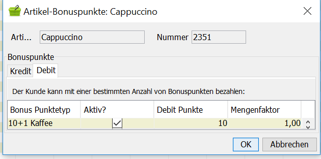 Beim Kauf von 10 Kaffees bekommt der Kunde einen Kaffee Gratis. In diesem Beispiel handelt es sich um einen Einfachen Artikelbonuspunkt