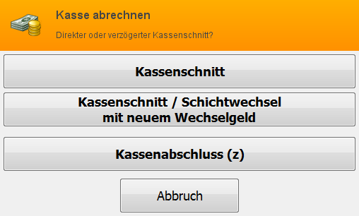 Stellt den aktuellen Kassenbestand fest und öffnet einen Dialog zur Auswahl der Abrechnungsart:
