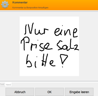 Dieses Kommando öffnet einen Dialog, in dem per Tastatur oder per Handschrift ein Kommentar zu einer Bonposition hinzugefügt werden kann.