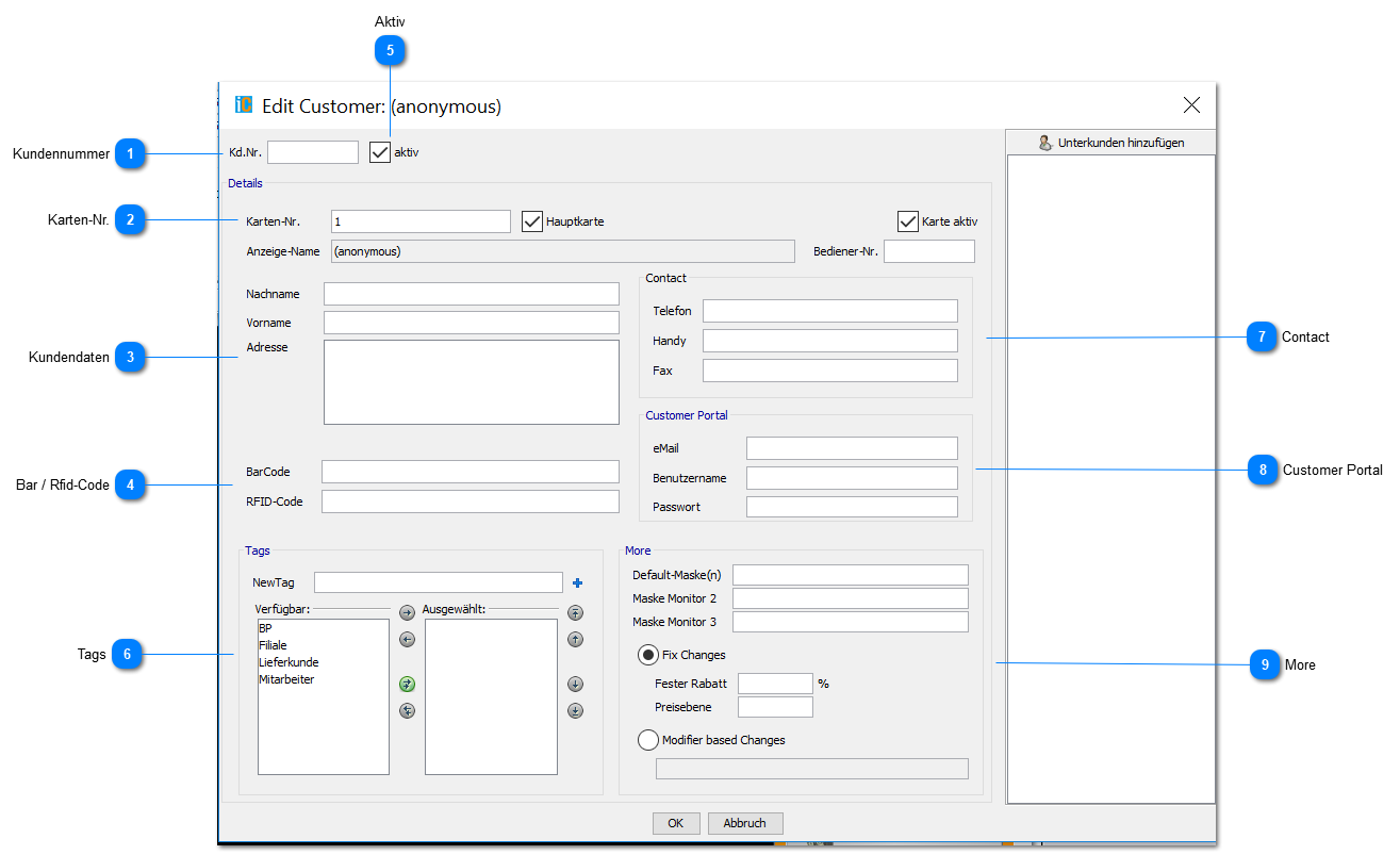 Eingabe des BarCodes bzw. RfiD-Code. Dadurch kann der Kunde an der Kasse einfach ausgewählt werden.