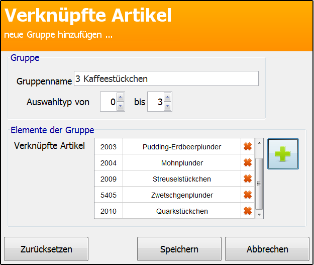 Als Gruppenname sollte ein Begriff gewählt werden, der eine klare Zuordnung sowohl der enthaltenen Artikel, als auch der hinterlegten auszuwählenden Menge ermöglicht.