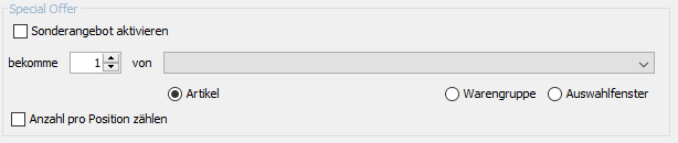Die Angebotsfunktion erlaubt vielfältige, vom Kauf eines Artikel abhängige, Einflussnahmen auf Artikelpreise. Ausgehend vom Kauf von einem oder mehreren Stück eines Artikels, kann ein Angebot ausgelöst werden das sich entweder auf den gleichen oder auf andere Artikel auswirkt. Dabei kann auch die gültige Stückzahl der möglichen Angebotsartikel berücksichtigt werden.